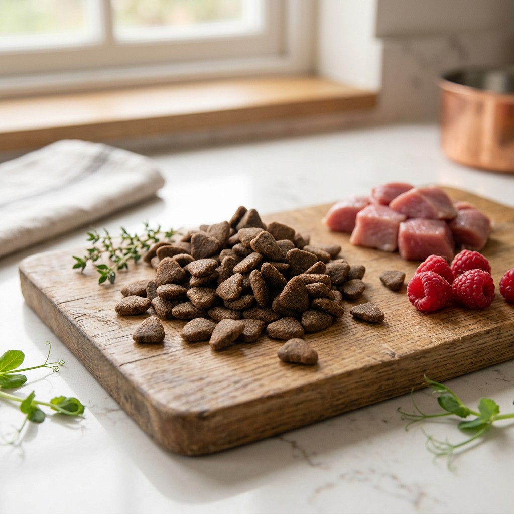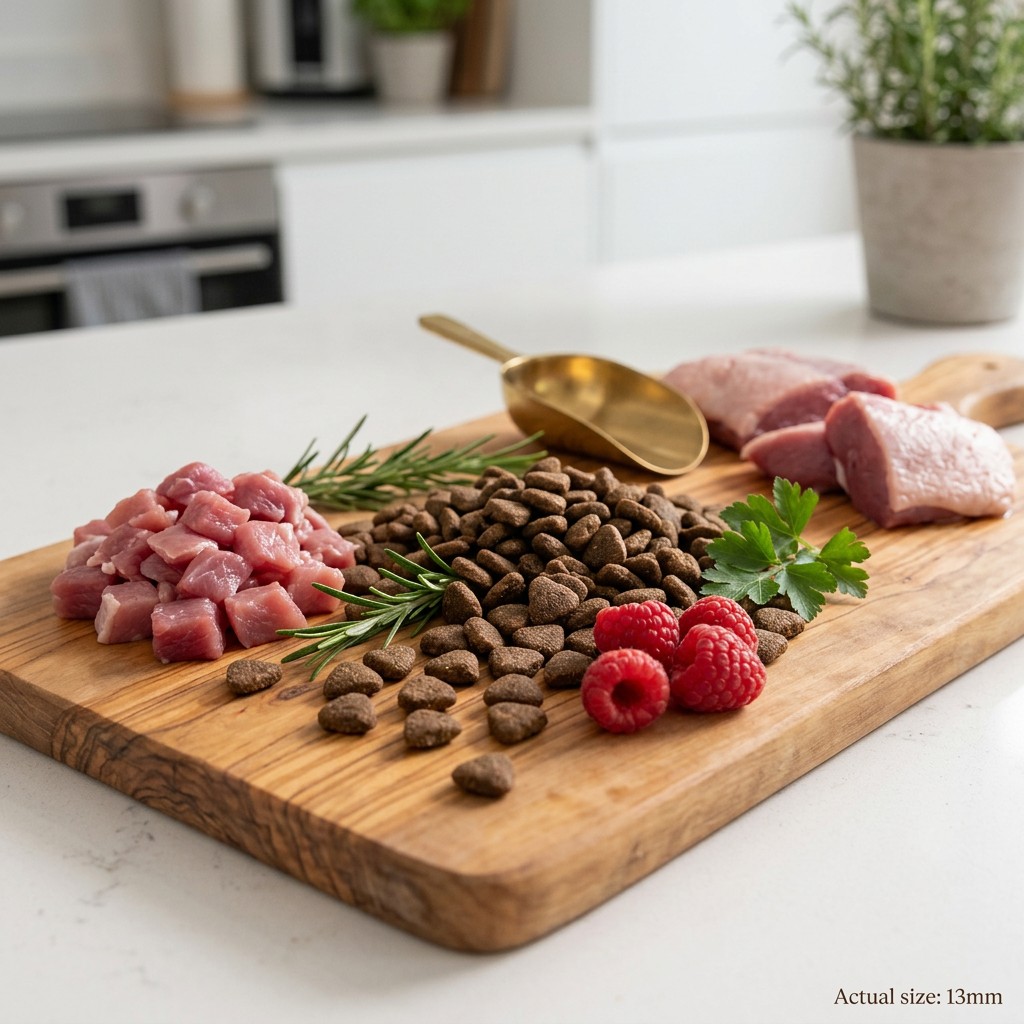 Kachní 50 % (čerstvé kachní 30 %, dehydratované kachní 20 %), batáty 9 %, hnědá rýže 9 %, sušené bramborové vločky 7 %, bílá rýže 6 %, krůtí tuk stabilizovaný přírodními tokoferoly 5 %, sušená řepná dužina 4 %, hydrolyzovaná játra 3 %, kvasnice 2 %, minerály, lněné semínko 1,5 %, sušený kořen čekanky 0,5 %, lososový olej 0,5 %, sušené maliny 5 g/kg, sušená červená řepa 3 g/kg, Yucca schidigera 1,5 g/kg, mannan-oligosacharidy 1,5 g/kg, bylinky 1 g/kg (tymián, rozmarýn, bazalka), chondroitin sulfát 280 mg/kg, glukosamin sulfát 190 mg/kg, inaktivovaný Lacticaseibacillus paracasei HA-108 (7,5×10⁹ buněk/kg).