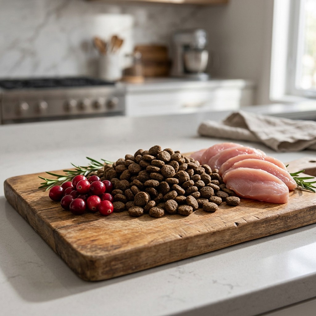 Jehněčí 50 % (čerstvé jehněčí 30 %, dehydrované jehněčí 20 %), batáty 8 %, hnědá rýže 7 %, sušené bramborové vločky 6 %, bílá rýže 6 %, červená čočka 4 %, krůtí tuk stabilizovaný přírodními tokoferoly 4 %, sušená řepná dužina 3 %, přírodní hrachový protein 3 %, hydrolyzovaná játra 3 %, kvasnice 2 %, minerály, lněné semínko 1 %, sušený kořen čekanky 0,5 %, lososový olej 0,5 %, sušený plod arónie 5 g/kg, sušená mrkev 3 g/kg, Yucca schidigera 1,5 g/kg, mannan-oligosacharidy 1,5 g/kg, bylinky 1 g/kg (tymián, rozmarýn, bazalka), chondroitin sulfát 280 mg/kg, glukosamin sulfát 190 mg/kg, inaktivovaný Lacticaseibacillus paracasei HA-108 (7,5×10⁹ buněk/kg).